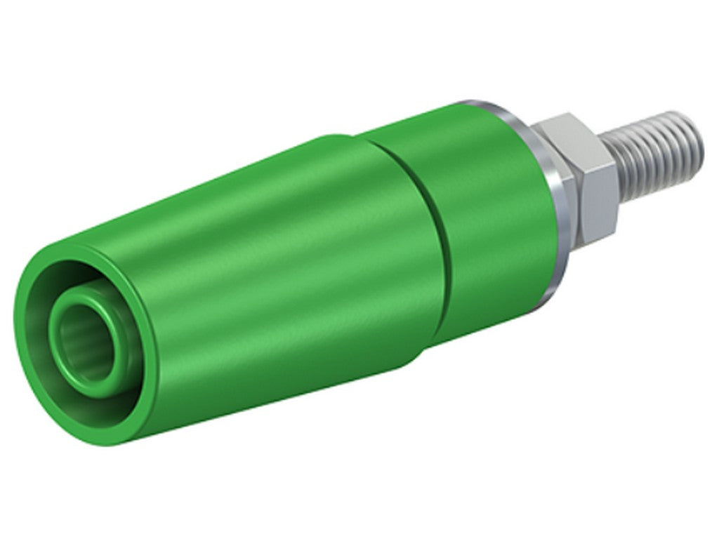. Insulated, rigid, Ø 4 mm, accepting spring-loaded Ø 4 mm plugs with rigid insulating sleeve. Machined brass. The socket is surface-mounted in pre-drilled panels of plastic, metal, etc. Threaded bolt M4.