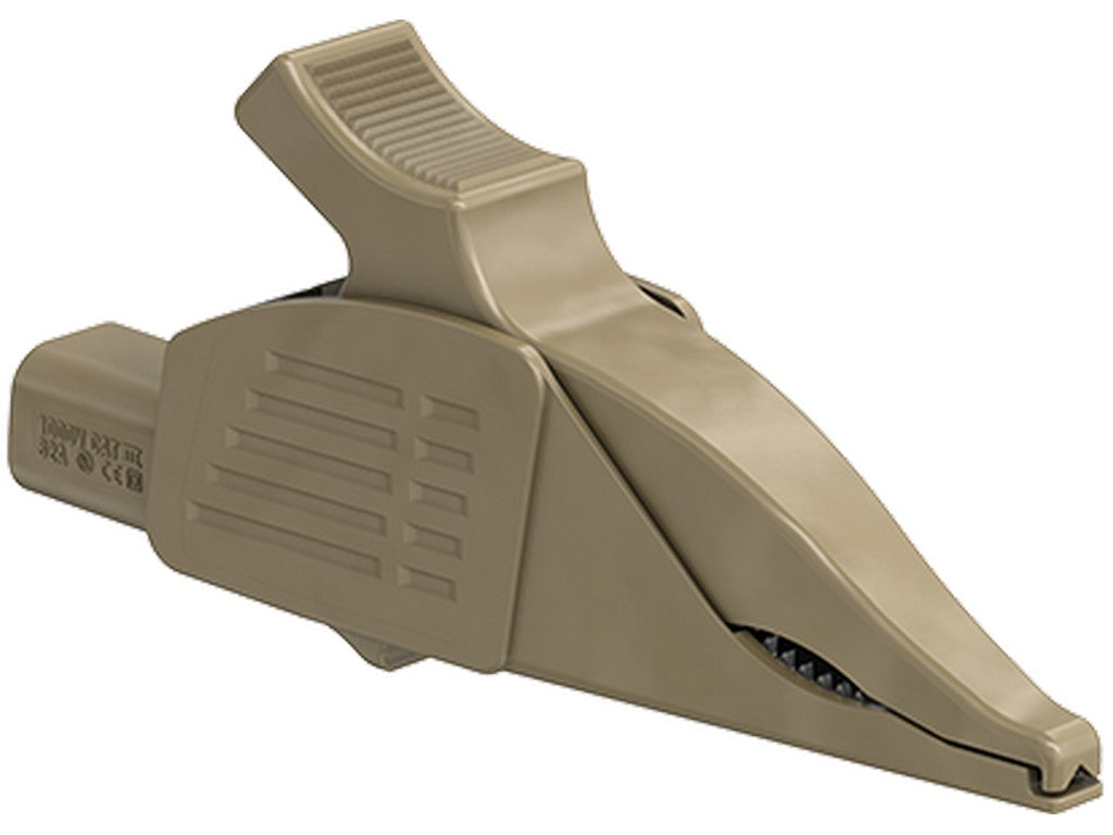 . Made of brass with all-round insulation. Toothed jaws for wide grip with surface for fine wire. Ø 4 mm rigid socket in insulator accepting spring-loaded Ø 4 mm plugs with rigid insulating sleeve.