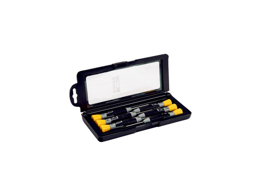 . Contains seven precision screwdrivers. Straight notch: 1.5 x 50; 2.5 x 50; 3.5 x 75 mm. Phillips: PH0 x 50, PH1 x 75 mm. TORX®: T6 x 50, T8 x 50. Phosphated tip for greater accuracy. Specially designed screwdriver for precision work, especially in the mechanical and electronics industry. Two-component handle with soft grip for quick and comfortable work. Color code on the top and marking on the handle for quick identification of the tip. Chrome-plated quality steel blade for high protection against rusting. Supplied in a plastic box with a hanging hole. Comfort handle with two-component handle, which transfers a high torque to the blade. Rotating top for fast, precise and delicate finger movements in connection with screwing. Machined phosphated tip ensures high precision. Rotating top for fast and more comfortable screwing