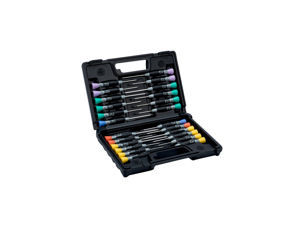 . Contains 24 screwdrivers. Straight notches: 1 x 50, 1.2 x 50, 1.5 x 50, 1.8 x 50, 2 x 50, 3 x 50, 3.5 x 75, 4 x 75 mm. Phillips: PH00 x 50, PH0 x 50, PH1 x 75mm. Pozidriv: PZ0 x 50, PZ1 x 75mm. TORX®: T6 x 50, T7 x 50, T8 x 50, T9 x 50, T10 x 50, T15 x 75, T20 x 75. Hexagon: H1.5 x 50, H2 x 50, H2.5 x 50, H3 x 75 mm. Phosphated tip for greater accuracy. Specially designed screwdriver for precision work, especially in the mechanical and electronics industry. Two-component handle with soft grip for quick and comfortable work. Color code on the top and marking on the handle for quick identification of the tip. Chrome-plated quality steel blade for great protection against rusting. Supplied in a plastic box with a hanging hole. Comfort handle with two-component handle, which transfers a high torque to the blade. Rotating top for fast, precise and delicate finger movements in connection with screwing. Machined phosphated tip ensures high precision. Perfect assembly at handle and blade