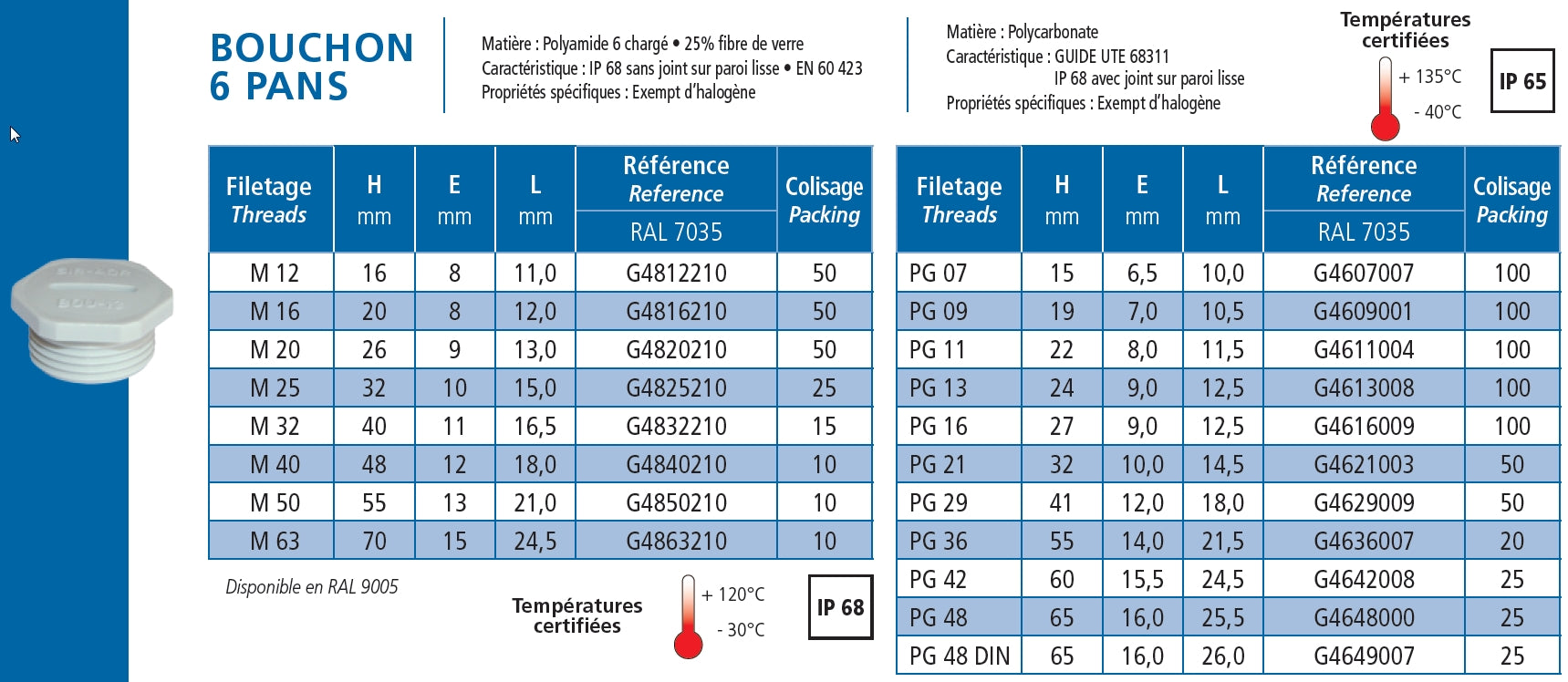 • Teknisk dokument: "G4600000 (C) BOUCHON POLYCARBONATE 6 PANS PG" (refereret fra producentens site)