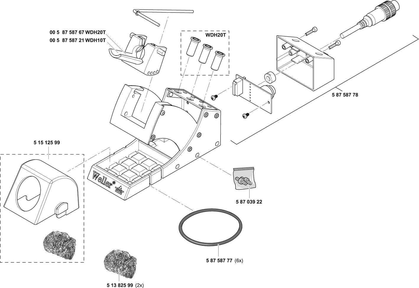 WDH 10T fra Weller er en sikkerhedsaflægning (Sicherheitsablage) med en indbygget Stop & Go-funktion. Produktet leveres med messingwolle (brass wool) til rengøring af loddespidser og angives som kompatibel med Weller lødkolberne WP 65, WP 80 og WP 120. Varenummeret hos producenten er T0051516199N.Funktioner