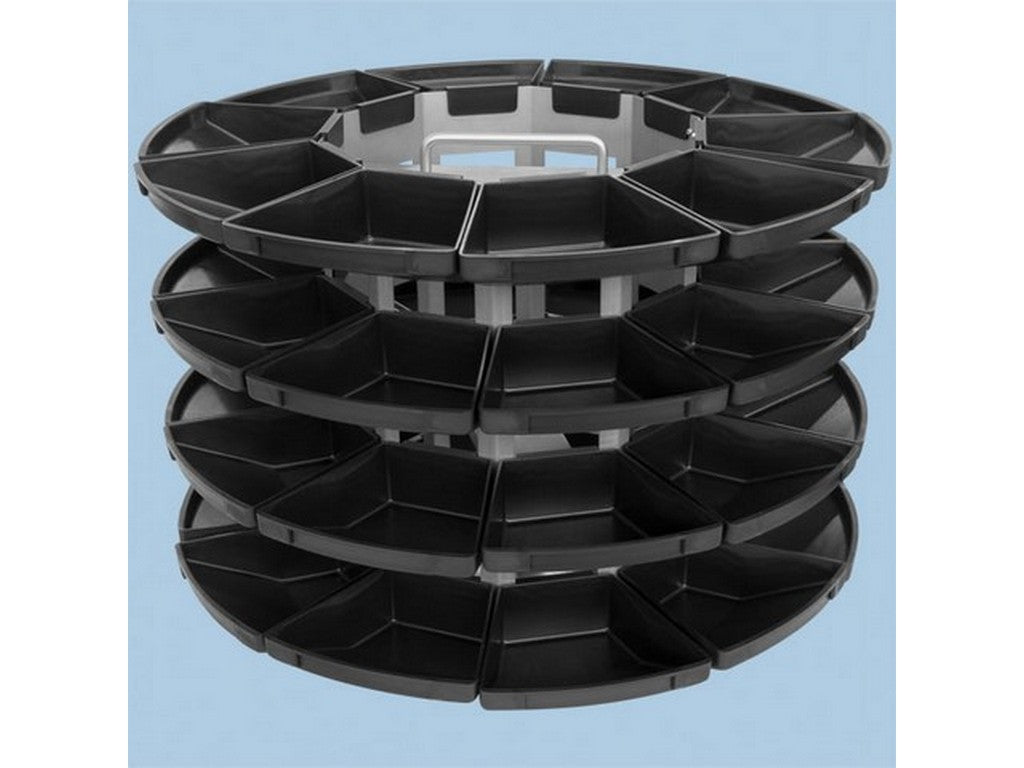 This bin carousel is especially suited for clear preparation and simple removal of e.g. electronic components, screws, etc. The basic element contains 40 bins (4 levels), which are arranged on a ball bearing carrier. They can be exchanged easily, but they cannot be turned independently. Due to a handle at the upper side, the carousel can be transported comfortably.