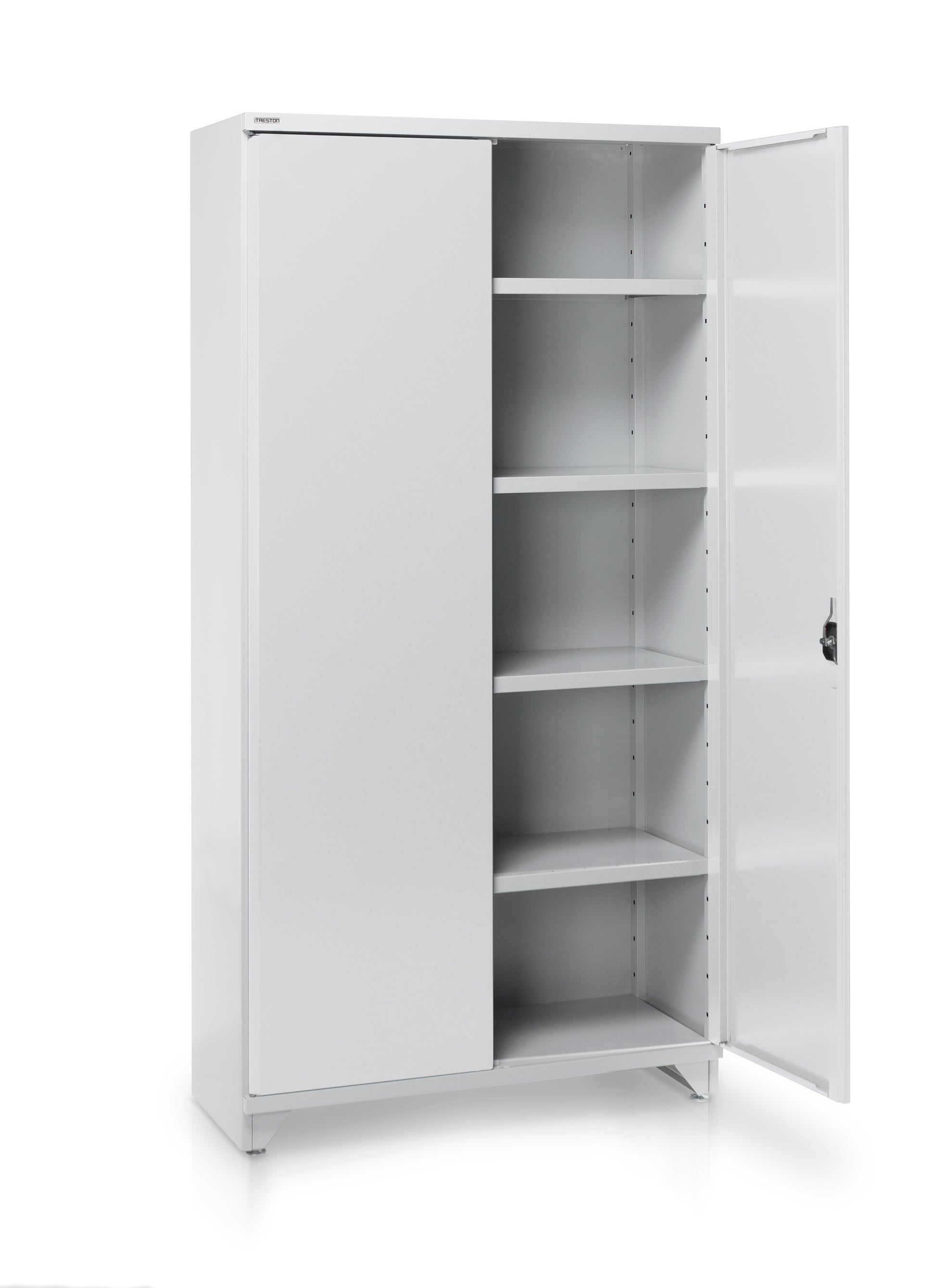 . The cabinet has sturdy double leaf-doors, flush fitting handle with two keys. Shelving cabinet can be moved with fork lift when it is empty and there are leveling screws under the cabinet for adjusting the cabinet straight. The shelving cabinets are pre-assembled.