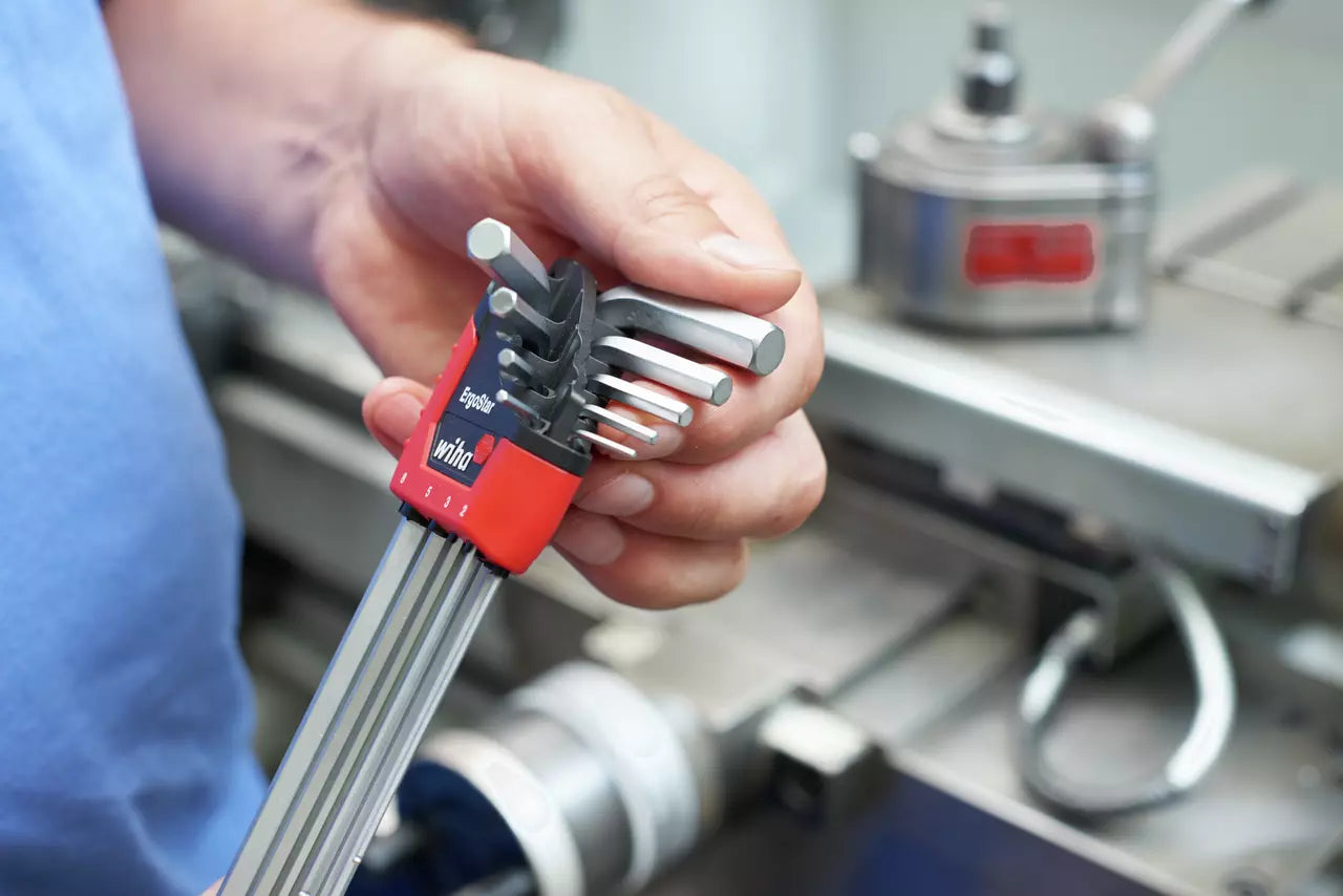 ErgoStar-holderen gør det muligt hurtigt at trække én L-nøgle ud ved at dreje en nøgle, så de øvrige drejer til siden. Holderen har en klemmemekanisme, som forhindrer at nøglerne falder ud, uanset om holderen er åben eller lukket. Fra størrelse 3 mm er MagicRing®-funktionen aktiv, hvilket gør det muligt at holde skruer fast uden brug af magnet. Kugleenden på nøglerne muliggør skruning i en vinkel op til 25°.
