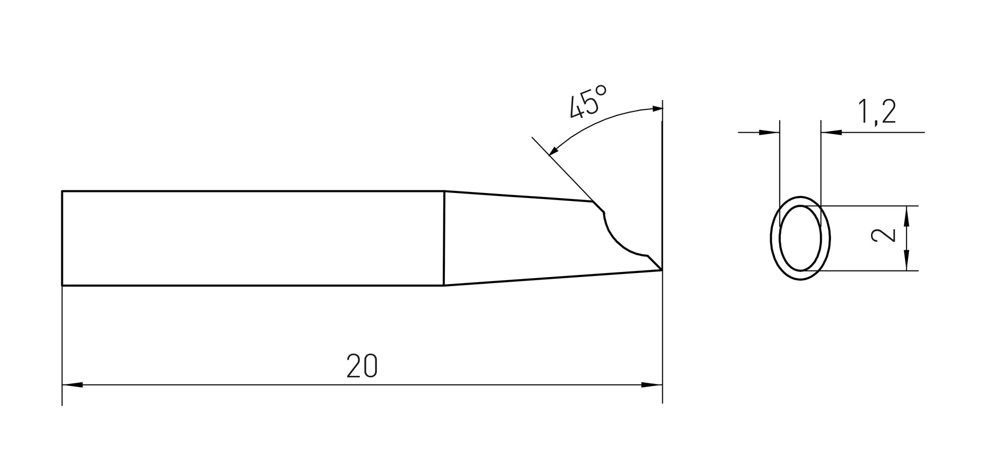 The Weller RTM 020 G (Item No. T0054461099N) is an RT Micro Gull Wing soldering tip designed for micro- and standard components. It is part of the Weller RT Micro Active Soldering Tips family and is specified as a high-performance active tip for precision soldering. According to the manufacturer's technical data, the tip's dimensions are Ø 1.2 x 2.0 mm, length 0.8 in (21 mm), and power rating 40 W.Features