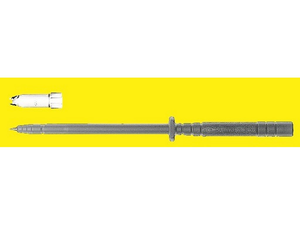 . Testsonde med tilspidset, stiv nål i rustfrit stål og med håndtagsbeskyttelse affaset på begge sider. Ø 4 mm stiv fatning i håndtag accepterer fjederbelastede Ø 4 mm stik med stiv isoleringsmuffe. Leveres med beskyttelseshætte.