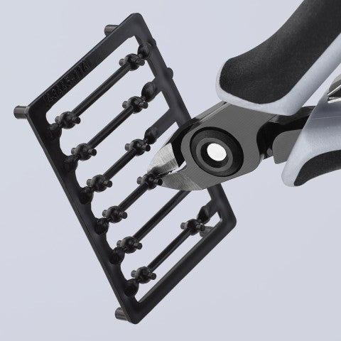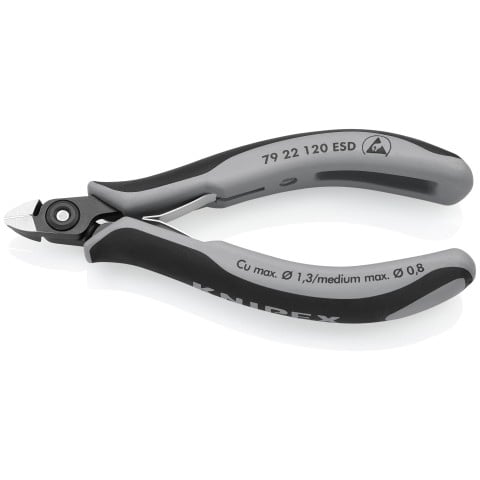 Denne præcisions-diagonalskærer til elektronik fra KNIPEX er beregnet til nøjagtig afkortning af ledere og komponentben. KNIPEX 79 22 120 ESD er angivet som en 4 3/4" (120 mm) værktøjslængde med ESD-afledende multi-komponent håndtag, der sikrer afledning af elektrostatisk energi via håndtagene.