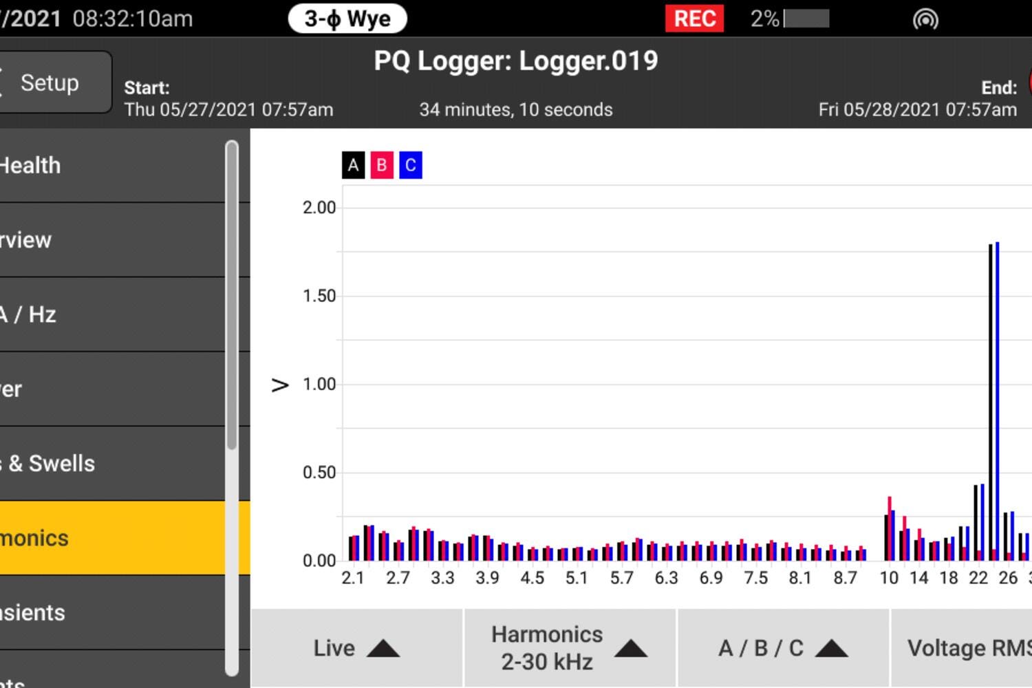 • Registrerer over 500 power quality-parametre, herunder V/A/Hz, effekt, dips, swells og harmoniske komponenter.