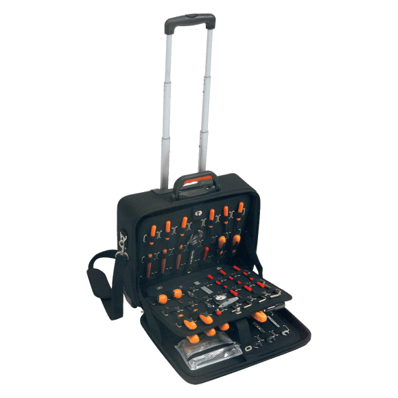 Dette produkt er en professionel værktøjsvogn fremstillet i EVA (Ethylene, Vinyl, Acetate) med en ramme forstærket i ABS. Beskrivelsen fastlægger konstruktion og funktionalitet uden yderligere antagelser: vognen har et dokumentrum, tre værktøjspaneler hvoraf to er aftagelige, samt elastiske holdere til værktøj. Produktet leveres med et teleskoperende aluminium trolley-håndtag og et ergonomisk greb med soft, skridsikkert materiale.